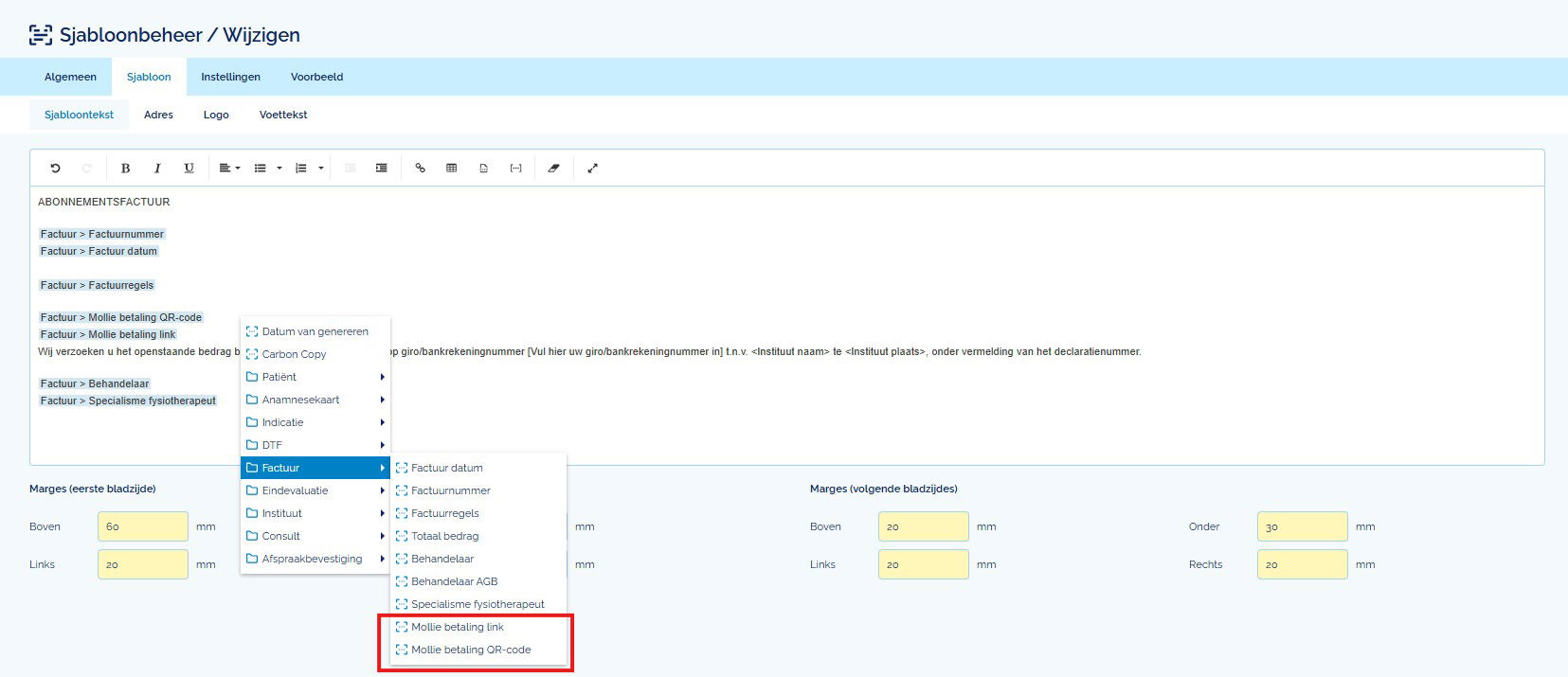 - Voeg in je factuursjabloon de twee nieuwe rechtermuisknop-opties toe om de link en/of QR-code op de factuur te tonen.