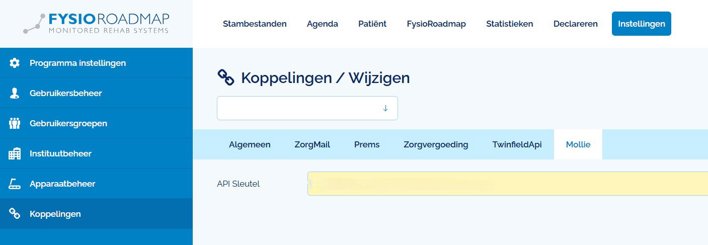 - Ga in FRM naar Instellingen → Koppelingen → vink Mollie aan → tab Mollie → plak de API-key (API-sleutel) → Opslaan.