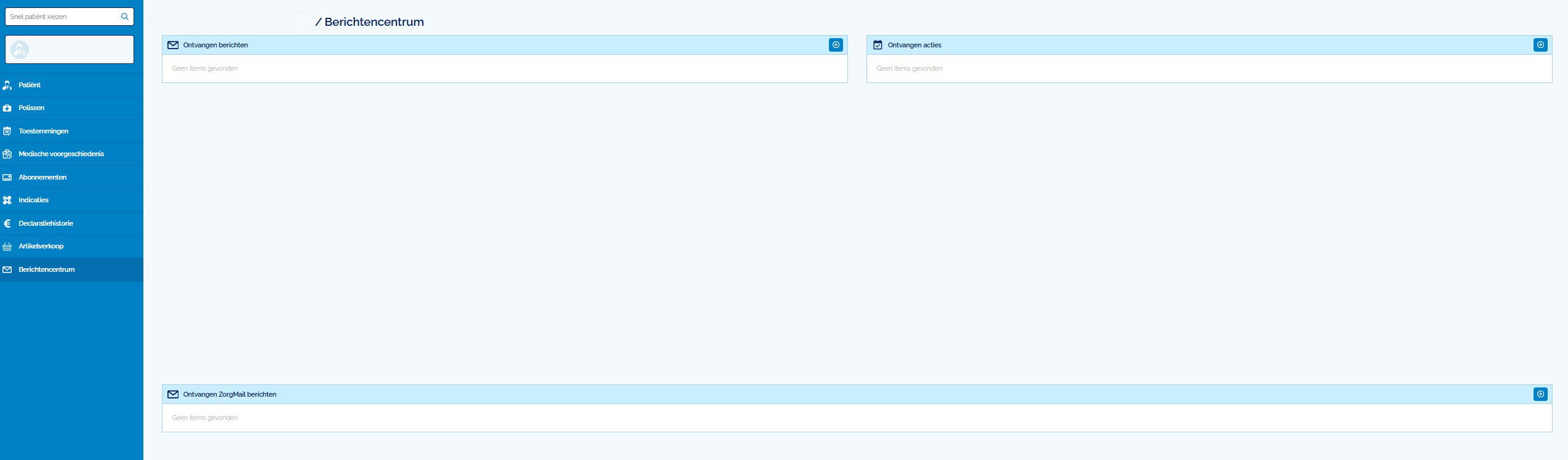 - Berichtencentrum op de patiëntenkaart: klik op “+” om direct een bericht of actie voor de geselecteerde patiënt aan te maken.