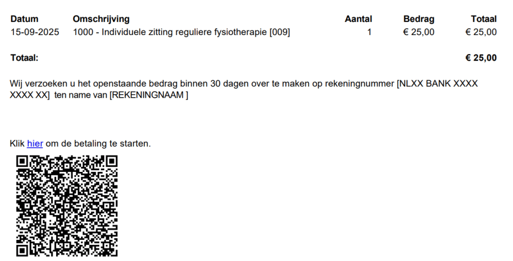 Mollie-betaallink & QR-code op je factuur Je kunt nu direct een Mollie-betaallink of QR-code toevoegen aan je facturen. Zo betaalt de patiënt in één klik of scan.- Maak een Mollie-account aan als je deze nog niet hebt: https://help.mollie.com/hc/nl/articles/210709969-Hoe-maak-ik-een-account-aan