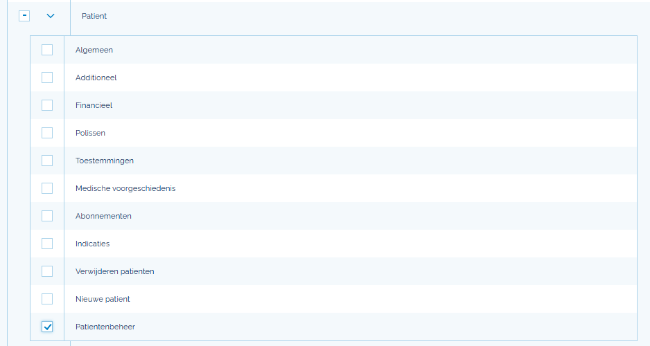 - Om toegang tot deze functionaliteit te krijgen, ga naar Instellingen → Gebruikersgroepen → kies je groep → een vinkje zetten bij 'Patiëntenbeheer' onder 'Patiënt'.
