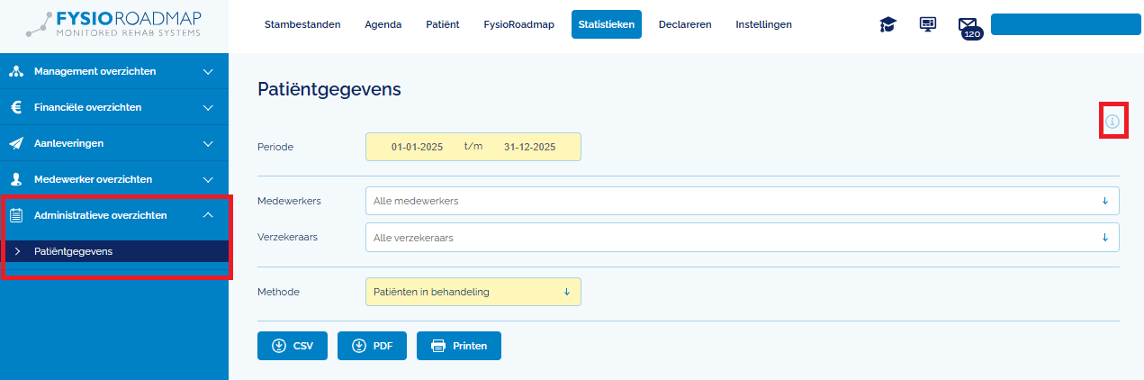 Patiëntgegevens printen Je kunt nu via Statistieken → Administratieve overzichten → Patiëntgegevens een overzicht maken van je patiënten. Handig voor bijvoorbeeld mailings, omdat je alle e-mailadressen in één keer ziet. Bij de export mogelijkheid kies je een periode, medewerker en instromend, uitstromend of patiënten in behandeling. Bij het informatie icoontje kunt je meer lezen over welke filters je kunt gebruiken voor een bepaalde uitkomst.